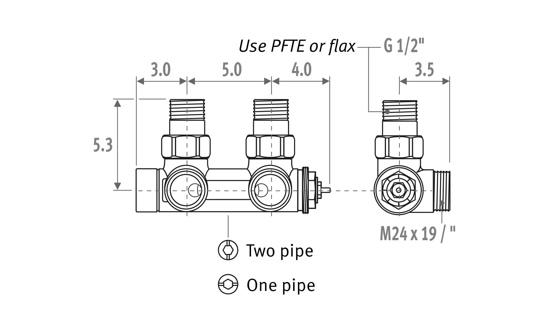 Kv-Wert Einrohr: 1.50 bis 2.20 m³/St. - Thermostatkopf: Gewinde M30 x 1.5 (Heimeier kompatibel)