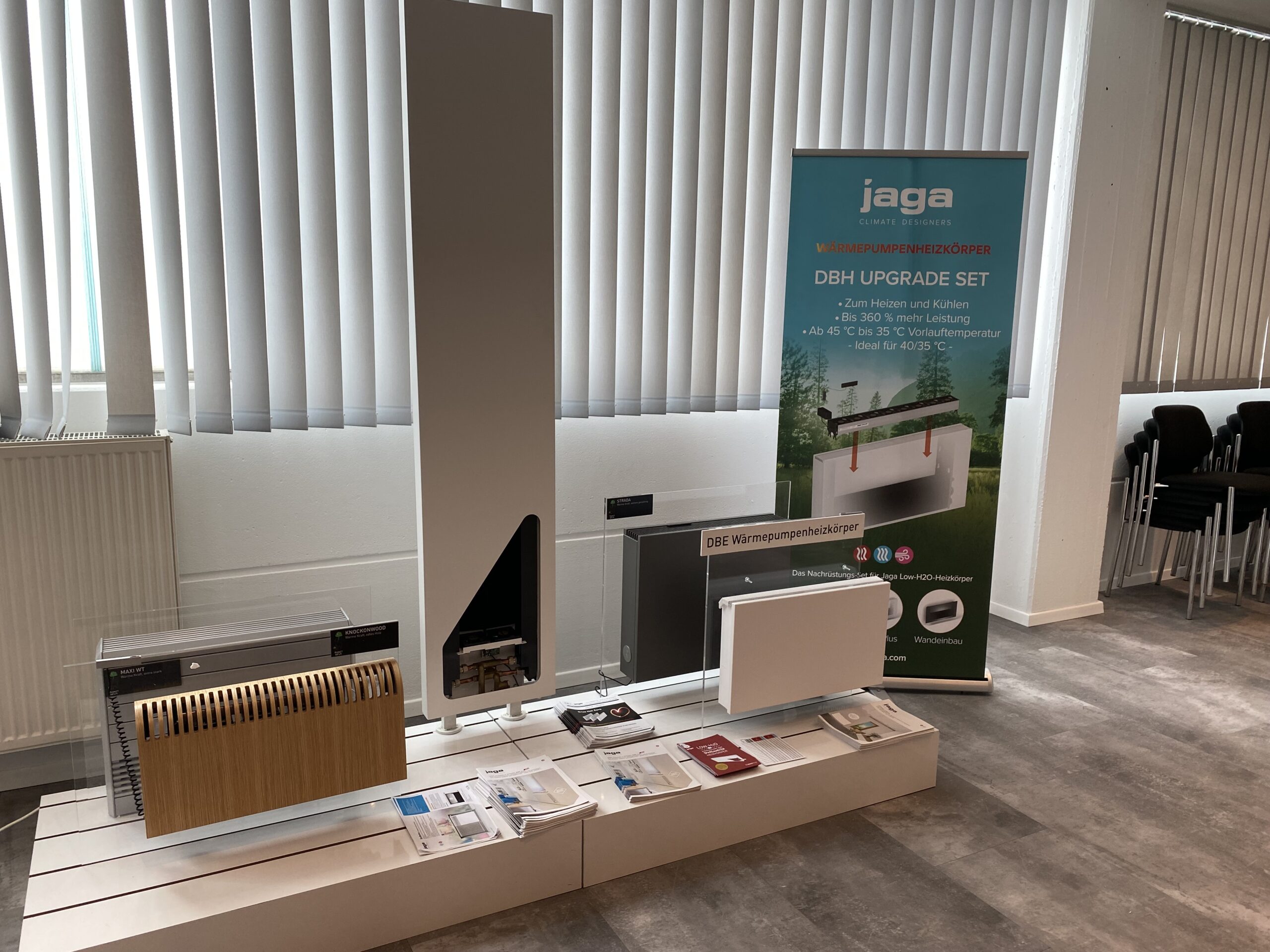 Wir laden Sie herzlich ein, unseren Showroom in Rosenheim nach Absprache zu besuchen. Erleben Sie die nachhaltigen Lösungen von Jaga für ein optimales Raumklima, darunter Knockonwood, Mini Standmodell, Strada, Linea Plus, Mini Canal und vieles mehr.